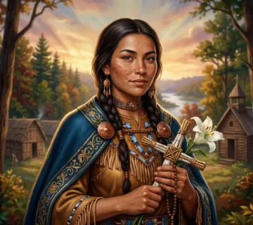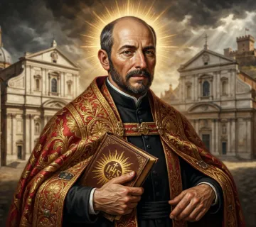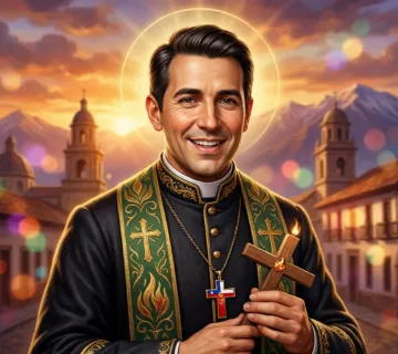 - 2Imię i nazwisko — Pełne imię świętego lub błogosławionego na zdobionym bannerze.